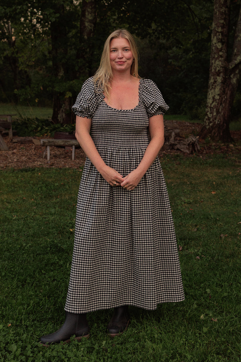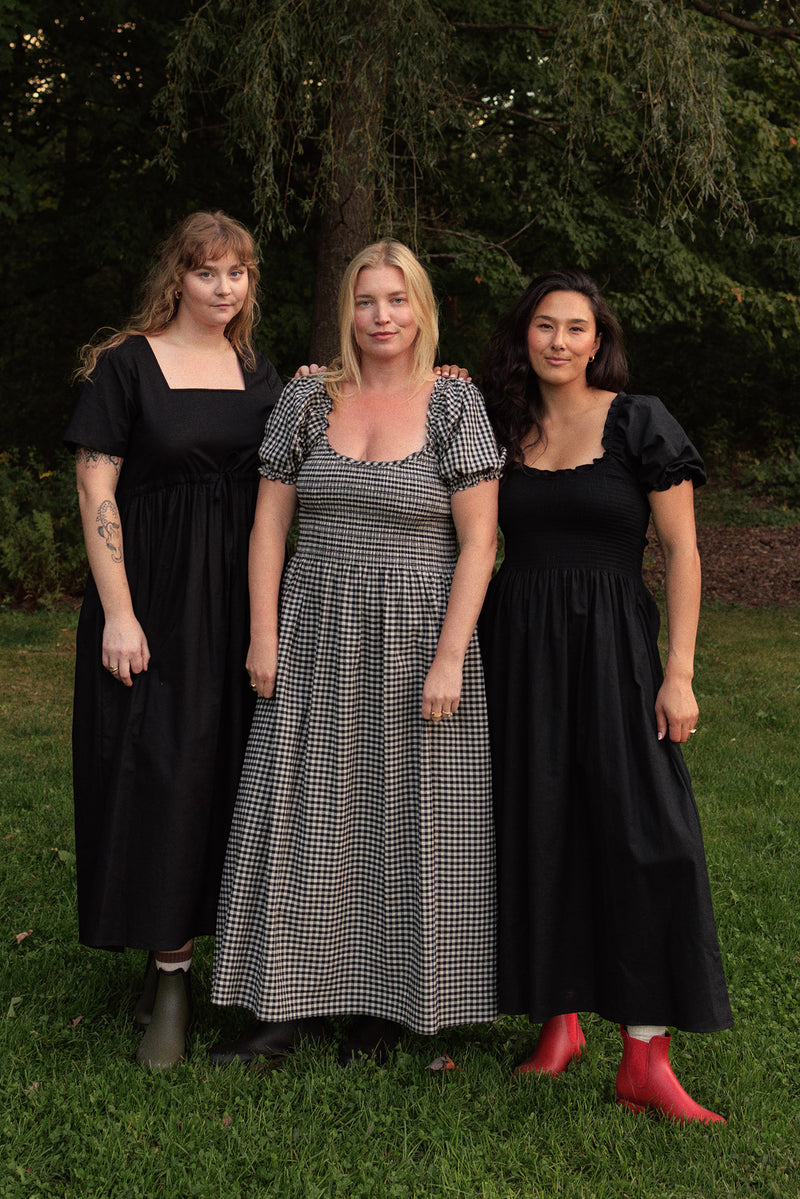 The Goldie Dress is years in the making and named after my daughter. I designed it during those months after she was born when I wanted something that worked with my changing body but still made me feel beautiful. The elasticated smocking moves and adjusts with you, while the scooped neckline stays bra-friendly. We spent so much time getting the smocking and fit perfect across XS to 4X. Flexible puff sleeves and midi length that is comfortable and easy.