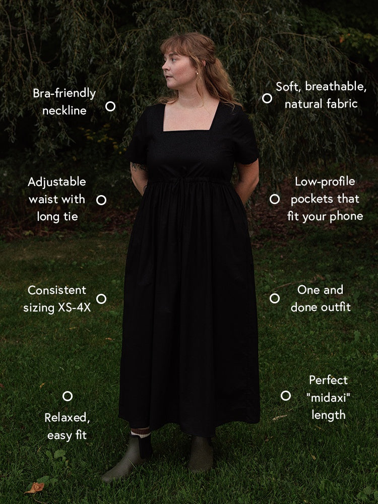 The elevated refresh of our all-time bestseller with a bra-friendly square neckline (practical magic) and just-longer-than-midi length. Made in natural materials and now updated with a drawstring waist so you can adjust the fit – cinch it in or keep it loose. Deep pockets that fit your phone. This is the dress that makes getting dressed the easiest part of your day.