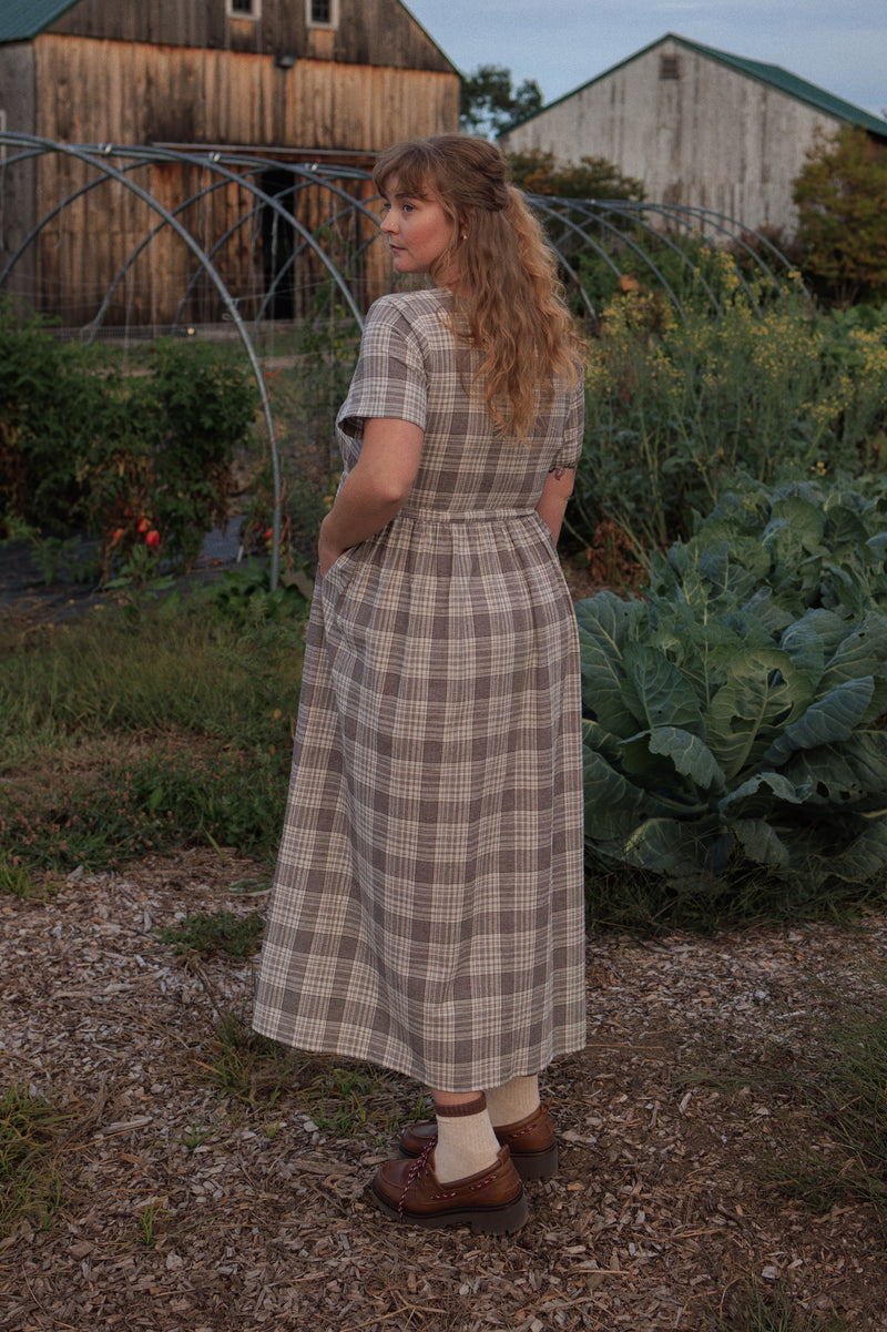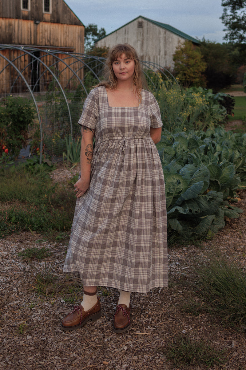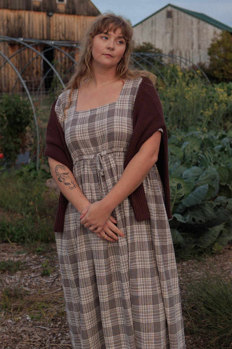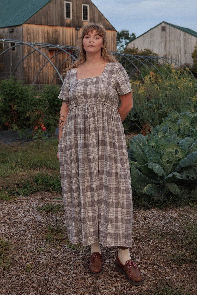 Nico Square Neck Drawstring Dress Cream Chocolate Plaid