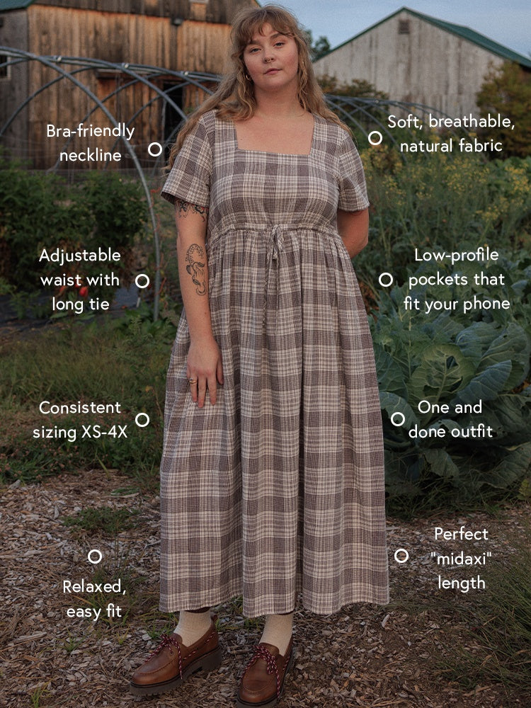 Nico Square Neck Drawstring Dress Cream Chocolate Plaid